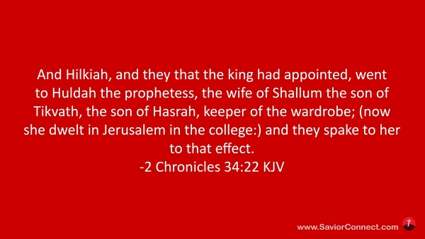 And Hilkiah, and they that the king had appointed, went to Huldah the prophetess, the wife of Shallum the son of Tikvath, the son of Hasrah, keeper of the wardrobe; (now she dwelt in Jerusalem in the college:) and they spake to her to that effect. -2 Chronicles 34:22 KJV