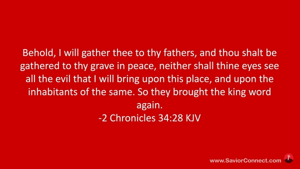 Behold, I will gather thee to thy fathers, and thou shalt be gathered to thy grave in peace, neither shall thine eyes see all the evil that I will bring upon this place, and upon the inhabitants of the same. So they brought the king word again. -2 Chronicles 34:28 KJV