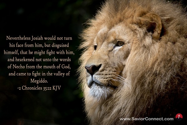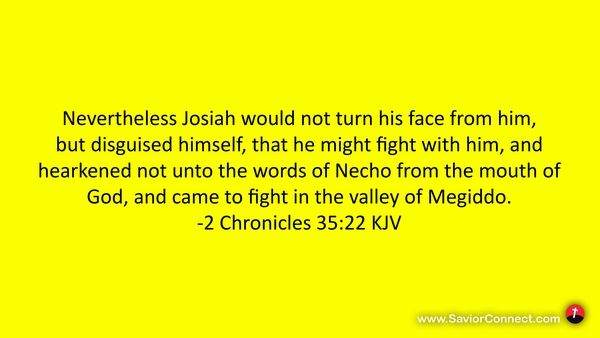 Nevertheless Josiah would not turn his face from him, but disguised himself, that he might fight with him, and hearkened not unto the words of Necho from the mouth of God, and came to fight in the valley of Megiddo. -2 Chronicles 35:22 KJV