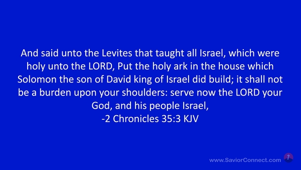 And said unto the Levites that taught all Israel, which were holy unto the LORD, Put the holy ark in the house which Solomon the son of David king of Israel did build; it shall not be a burden upon your shoulders: serve now the LORD your God, and his people Israel, -2 Chronicles 35:3 KJV