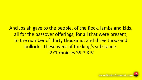 And Josiah gave to the people, of the flock, lambs and kids, all for the passover offerings, for all that were present, to the number of thirty thousand, and three thousand bullocks: these were of the king's substance. -2 Chronicles 35:7 KJV