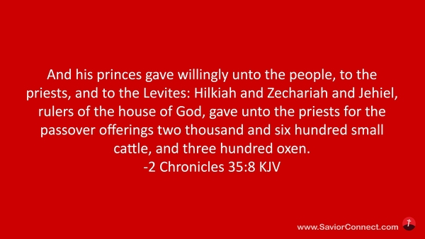 And his princes gave willingly unto the people, to the priests, and to the Levites: Hilkiah and Zechariah and Jehiel, rulers of the house of God, gave unto the priests for the passover offerings two thousand and six hundred small cattle, and three hundred oxen. -2 Chronicles 35:8 KJV
