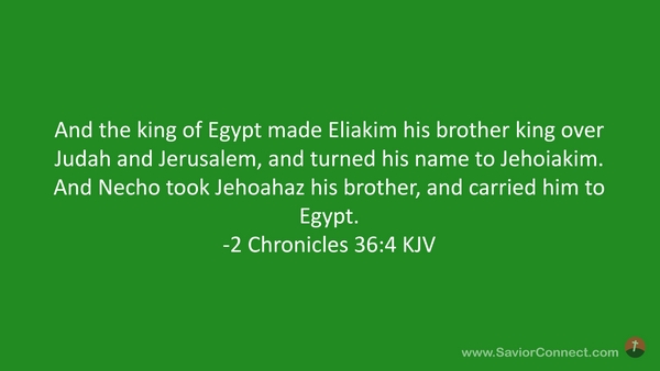 And the king of Egypt made Eliakim his brother king over Judah and Jerusalem, and turned his name to Jehoiakim. And Necho took Jehoahaz his brother, and carried him to Egypt. -2 Chronicles 36:4 KJV