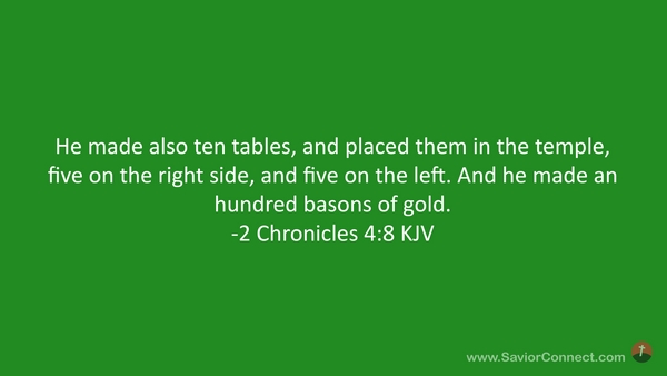 He made also ten tables, and placed them in the temple, five on the right side, and five on the left. And he made an hundred basons of gold. -2 Chronicles 4:8 KJV