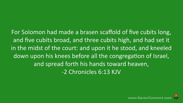 For Solomon had made a brasen scaffold of five cubits long, and five cubits broad, and three cubits high, and had set it in the midst of the court: and upon it he stood, and kneeled down upon his knees before all the congregation of Israel, and spread forth his hands toward heaven, -2 Chronicles 6:13 KJV