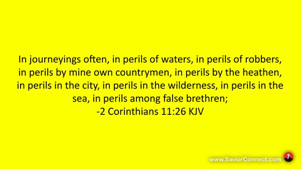 In journeyings often, in perils of waters, in perils of robbers, in perils by mine own countrymen, in perils by the heathen, in perils in the city, in perils in the wilderness, in perils in the sea, in perils among false brethren; -2 Corinthians 11:26 KJV