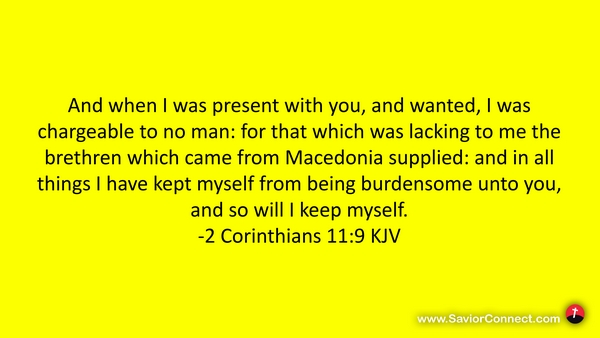 And when I was present with you, and wanted, I was chargeable to no man: for that which was lacking to me the brethren which came from Macedonia supplied: and in all things I have kept myself from being burdensome unto you, and so will I keep myself. -2 Corinthians 11:9 KJV