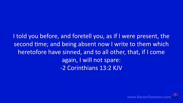 I told you before, and foretell you, as if I were present, the second time; and being absent now I write to them which heretofore have sinned, and to all other, that, if I come again, I will not spare: -2 Corinthians 13:2 KJV