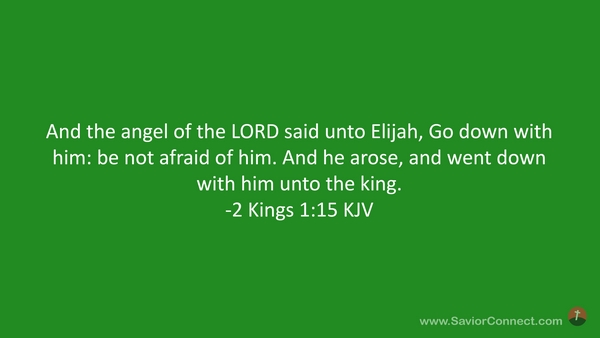 And the angel of the LORD said unto Elijah, Go down with him: be not afraid of him. And he arose, and went down with him unto the king. -2 Kings 1:15 KJV