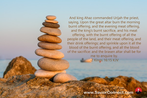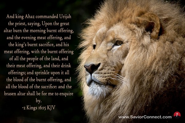 And king Ahaz commanded Urijah the priest, saying, Upon the great altar burn the morning burnt offering, and the evening meat offering, and the king's burnt sacrifice, and his meat offering, with the burnt offering of all the people of the land, and their meat offering, and their drink offerings; and sprinkle upon it all the blood of the burnt offering, and all the blood of the sacrifice: and the brasen altar shall be for me to enquire by. -2 Kings 16:15 KJV