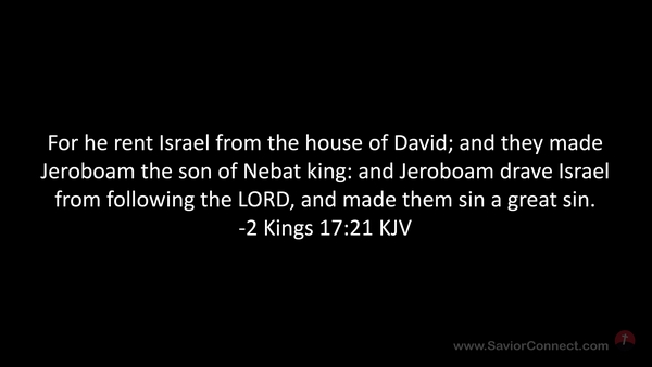 For he rent Israel from the house of David; and they made Jeroboam the son of Nebat king: and Jeroboam drave Israel from following the LORD, and made them sin a great sin. -2 Kings 17:21 KJV