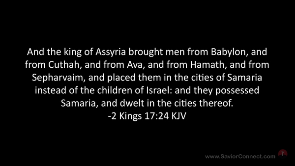 And the king of Assyria brought men from Babylon, and from Cuthah, and from Ava, and from Hamath, and from Sepharvaim, and placed them in the cities of Samaria instead of the children of Israel: and they possessed Samaria, and dwelt in the cities thereof. -2 Kings 17:24 KJV