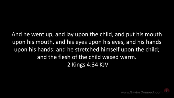 And he went up, and lay upon the child, and put his mouth upon his mouth, and his eyes upon his eyes, and his hands upon his hands: and he stretched himself upon the child; and the flesh of the child waxed warm. -2 Kings 4:34 KJV