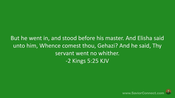 But he went in, and stood before his master. And Elisha said unto him, Whence comest thou, Gehazi? And he said, Thy servant went no whither. -2 Kings 5:25 KJV
