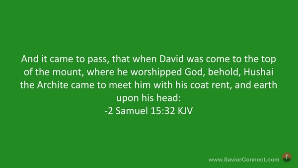 And it came to pass, that when David was come to the top of the mount, where he worshipped God, behold, Hushai the Archite came to meet him with his coat rent, and earth upon his head: -2 Samuel 15:32 KJV