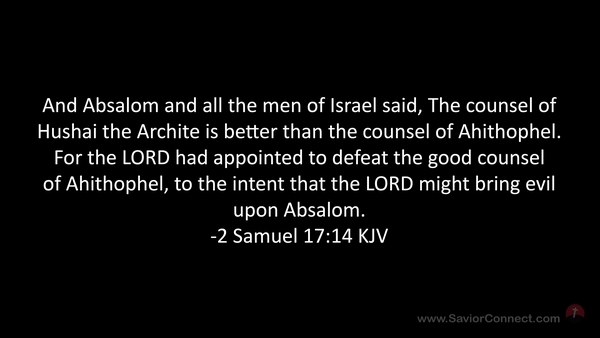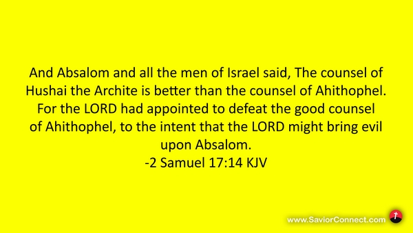 And Absalom and all the men of Israel said, The counsel of Hushai the Archite is better than the counsel of Ahithophel. For the LORD had appointed to defeat the good counsel of Ahithophel, to the intent that the LORD might bring evil upon Absalom. -2 Samuel 17:14 KJV