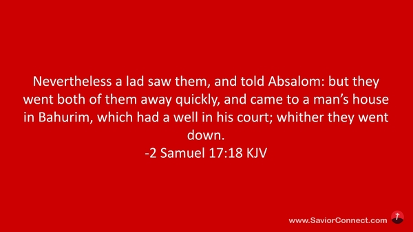 Nevertheless a lad saw them, and told Absalom: but they went both of them away quickly, and came to a man's house in Bahurim, which had a well in his court; whither they went down. -2 Samuel 17:18 KJV