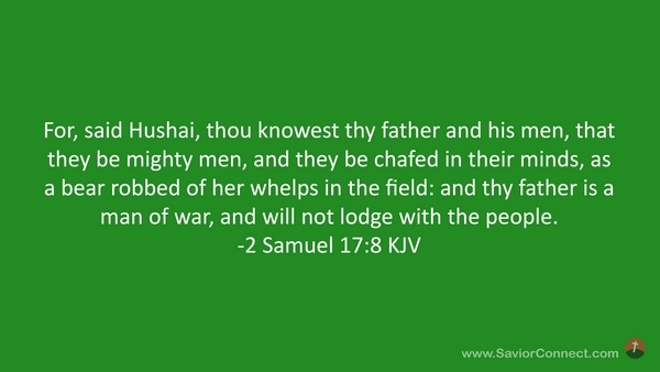 For, said Hushai, thou knowest thy father and his men, that they be mighty men, and they be chafed in their minds, as a bear robbed of her whelps in the field: and thy father is a man of war, and will not lodge with the people. -2 Samuel 17:8 KJV