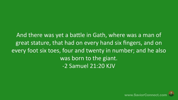 And there was yet a battle in Gath, where was a man of great stature, that had on every hand six fingers, and on every foot six toes, four and twenty in number; and he also was born to the giant. -2 Samuel 21:20 KJV