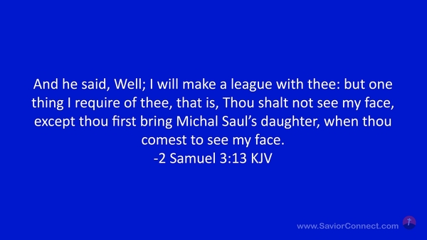 And he said, Well; I will make a league with thee: but one thing I require of thee, that is, Thou shalt not see my face, except thou first bring Michal Saul's daughter, when thou comest to see my face. -2 Samuel 3:13 KJV