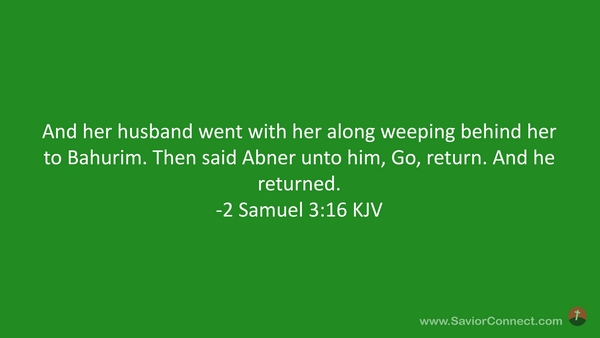 And her husband went with her along weeping behind her to Bahurim. Then said Abner unto him, Go, return. And he returned. -2 Samuel 3:16 KJV