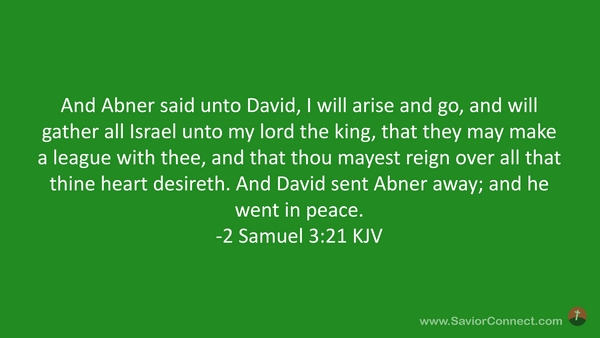 And Abner said unto David, I will arise and go, and will gather all Israel unto my lord the king, that they may make a league with thee, and that thou mayest reign over all that thine heart desireth. And David sent Abner away; and he went in peace. -2 Samuel 3:21 KJV