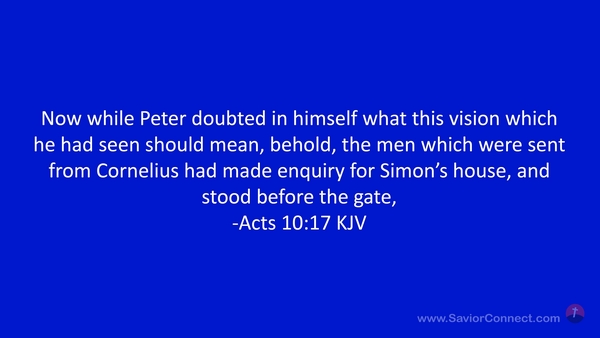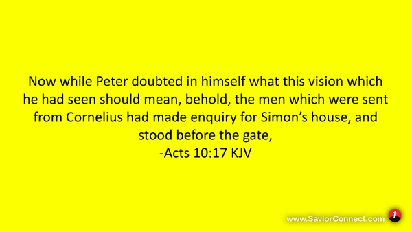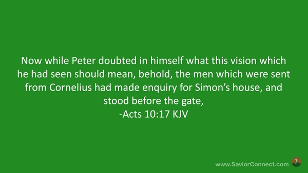 Now while Peter doubted in himself what this vision which he had seen should mean, behold, the men which were sent from Cornelius had made enquiry for Simon's house, and stood before the gate, -Acts 10:17 KJV