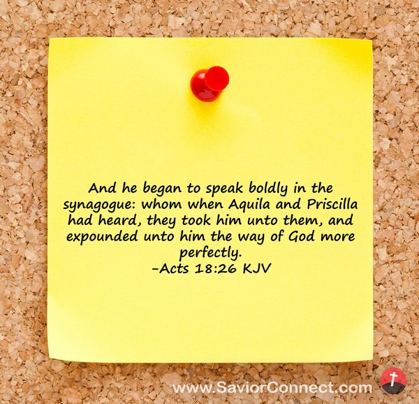 And he began to speak boldly in the synagogue: whom when Aquila and Priscilla had heard, they took him unto them, and expounded unto him the way of God more perfectly. -Acts 18:26 KJV
