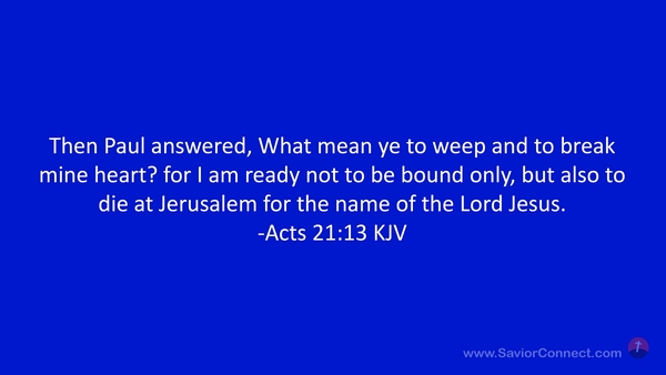 Then Paul answered, What mean ye to weep and to break mine heart? for I am ready not to be bound only, but also to die at Jerusalem for the name of the Lord Jesus. -Acts 21:13 KJV