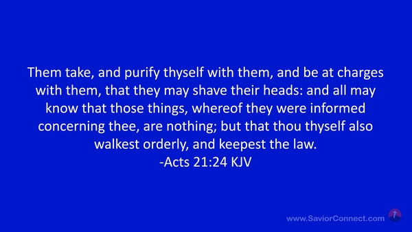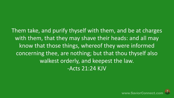 Them take, and purify thyself with them, and be at charges with them, that they may shave their heads: and all may know that those things, whereof they were informed concerning thee, are nothing; but that thou thyself also walkest orderly, and keepest the law. -Acts 21:24 KJV