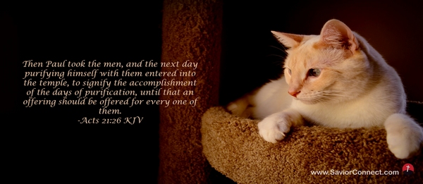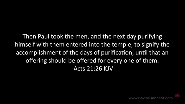 Then Paul took the men, and the next day purifying himself with them entered into the temple, to signify the accomplishment of the days of purification, until that an offering should be offered for every one of them. -Acts 21:26 KJV