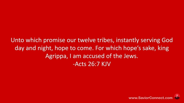 Unto which promise our twelve tribes, instantly serving God day and night, hope to come. For which hope's sake, king Agrippa, I am accused of the Jews. -Acts 26:7 KJV