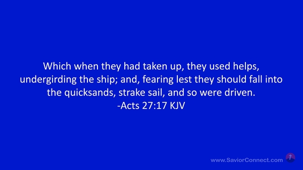 Which when they had taken up, they used helps, undergirding the ship; and, fearing lest they should fall into the quicksands, strake sail, and so were driven. -Acts 27:17 KJV