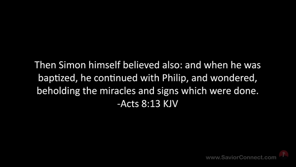 Then Simon himself believed also: and when he was baptized, he continued with Philip, and wondered, beholding the miracles and signs which were done. -Acts 8:13 KJV