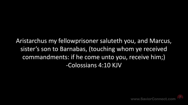 Aristarchus my fellowprisoner saluteth you, and Marcus, sister's son to Barnabas, (touching whom ye received commandments: if he come unto you, receive him;) -Colossians 4:10 KJV