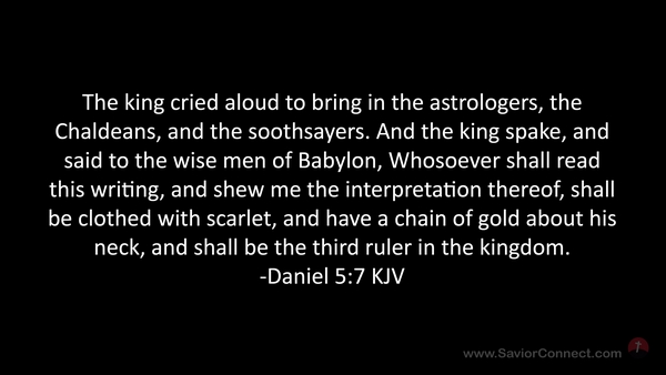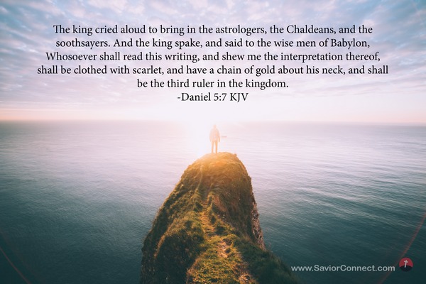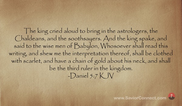 The king cried aloud to bring in the astrologers, the Chaldeans, and the soothsayers. And the king spake, and said to the wise men of Babylon, Whosoever shall read this writing, and shew me the interpretation thereof, shall be clothed with scarlet, and have a chain of gold about his neck, and shall be the third ruler in the kingdom. -Daniel 5:7 KJV