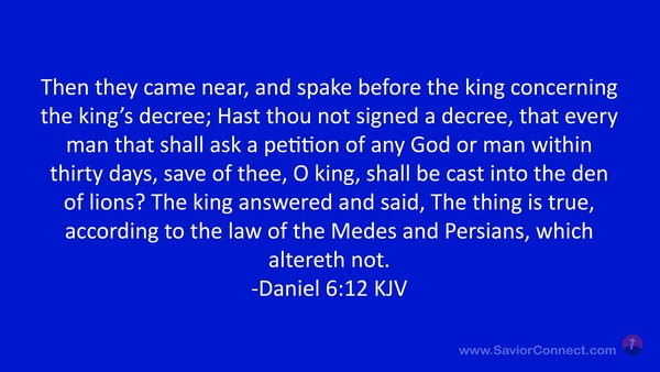 Then they came near, and spake before the king concerning the king's decree; Hast thou not signed a decree, that every man that shall ask a petition of any God or man within thirty days, save of thee, O king, shall be cast into the den of lions? The king answered and said, The thing is true, according to the law of the Medes and Persians, which altereth not. -Daniel 6:12 KJV