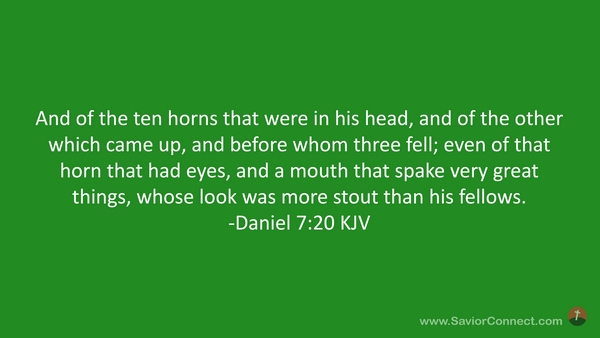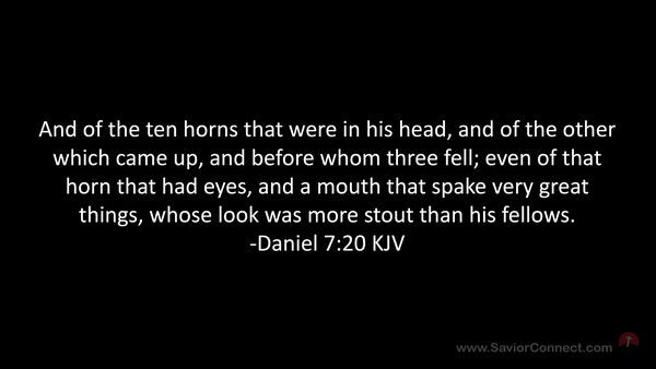 And of the ten horns that were in his head, and of the other which came up, and before whom three fell; even of that horn that had eyes, and a mouth that spake very great things, whose look was more stout than his fellows. -Daniel 7:20 KJV