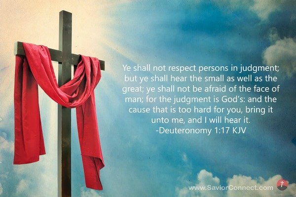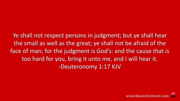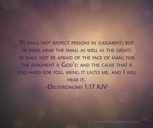 Ye shall not respect persons in judgment; but ye shall hear the small as well as the great; ye shall not be afraid of the face of man; for the judgment is God's: and the cause that is too hard for you, bring it unto me, and I will hear it. -Deuteronomy 1:17 KJV