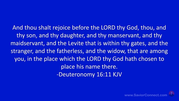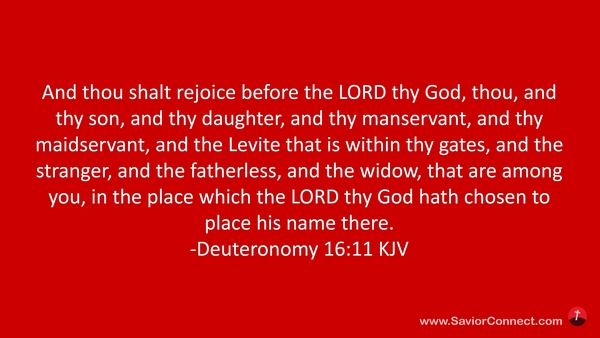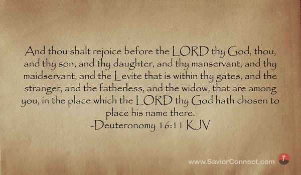 And thou shalt rejoice before the LORD thy God, thou, and thy son, and thy daughter, and thy manservant, and thy maidservant, and the Levite that is within thy gates, and the stranger, and the fatherless, and the widow, that are among you, in the place which the LORD thy God hath chosen to place his name there. -Deuteronomy 16:11 KJV