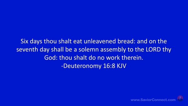 Six days thou shalt eat unleavened bread: and on the seventh day shall be a solemn assembly to the LORD thy God: thou shalt do no work therein. -Deuteronomy 16:8 KJV
