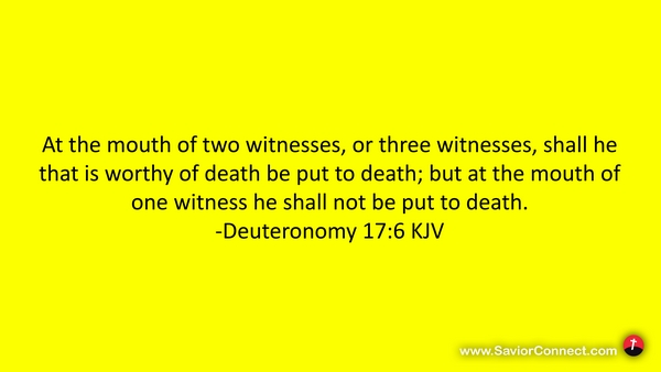 At the mouth of two witnesses, or three witnesses, shall he that is worthy of death be put to death; but at the mouth of one witness he shall not be put to death. -Deuteronomy 17:6 KJV
