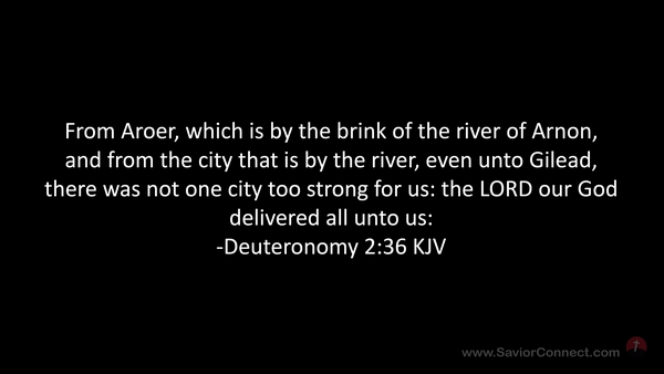 From Aroer, which is by the brink of the river of Arnon, and from the city that is by the river, even unto Gilead, there was not one city too strong for us: the LORD our God delivered all unto us: -Deuteronomy 2:36 KJV