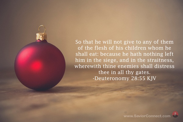 So that he will not give to any of them of the flesh of his children whom he shall eat: because he hath nothing left him in the siege, and in the straitness, wherewith thine enemies shall distress thee in all thy gates. -Deuteronomy 28:55 KJV