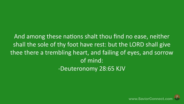 And among these nations shalt thou find no ease, neither shall the sole of thy foot have rest: but the LORD shall give thee there a trembling heart, and failing of eyes, and sorrow of mind: -Deuteronomy 28:65 KJV