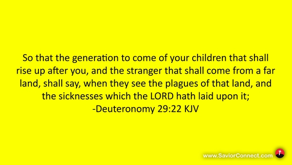So that the generation to come of your children that shall rise up after you, and the stranger that shall come from a far land, shall say, when they see the plagues of that land, and the sicknesses which the LORD hath laid upon it; -Deuteronomy 29:22 KJV