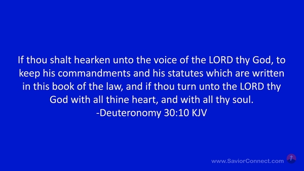 If thou shalt hearken unto the voice of the LORD thy God, to keep his commandments and his statutes which are written in this book of the law, and if thou turn unto the LORD thy God with all thine heart, and with all thy soul. -Deuteronomy 30:10 KJV