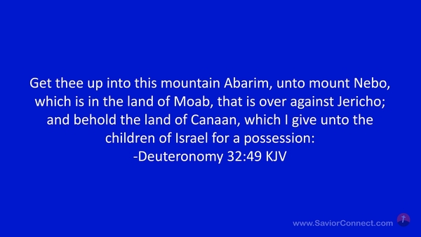 Get thee up into this mountain Abarim, unto mount Nebo, which is in the land of Moab, that is over against Jericho; and behold the land of Canaan, which I give unto the children of Israel for a possession: -Deuteronomy 32:49 KJV