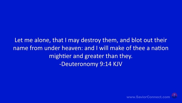 Let me alone, that I may destroy them, and blot out their name from under heaven: and I will make of thee a nation mightier and greater than they. -Deuteronomy 9:14 KJV