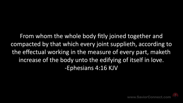From whom the whole body fitly joined together and compacted by that which every joint supplieth, according to the effectual working in the measure of every part, maketh increase of the body unto the edifying of itself in love. -Ephesians 4:16 KJV